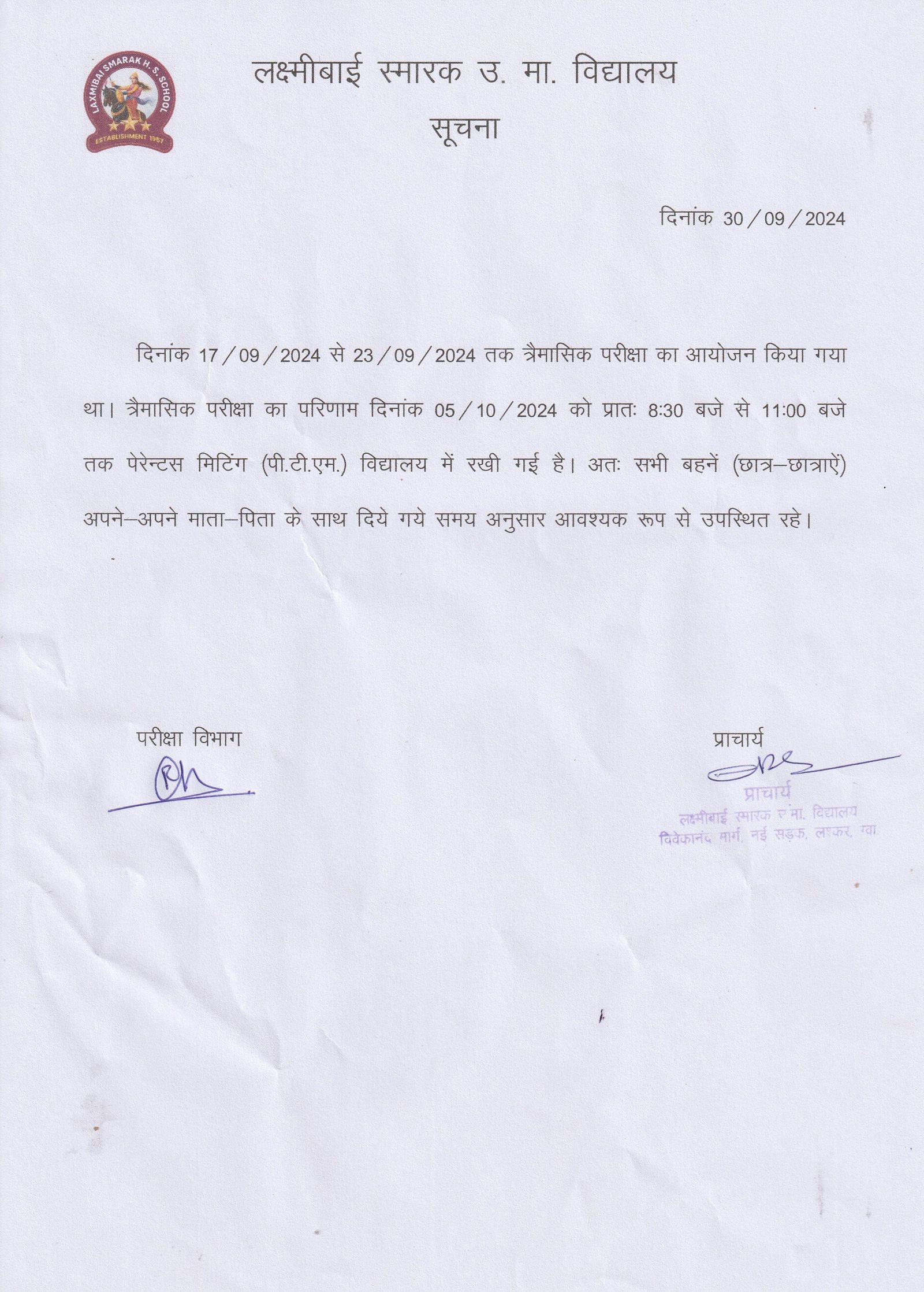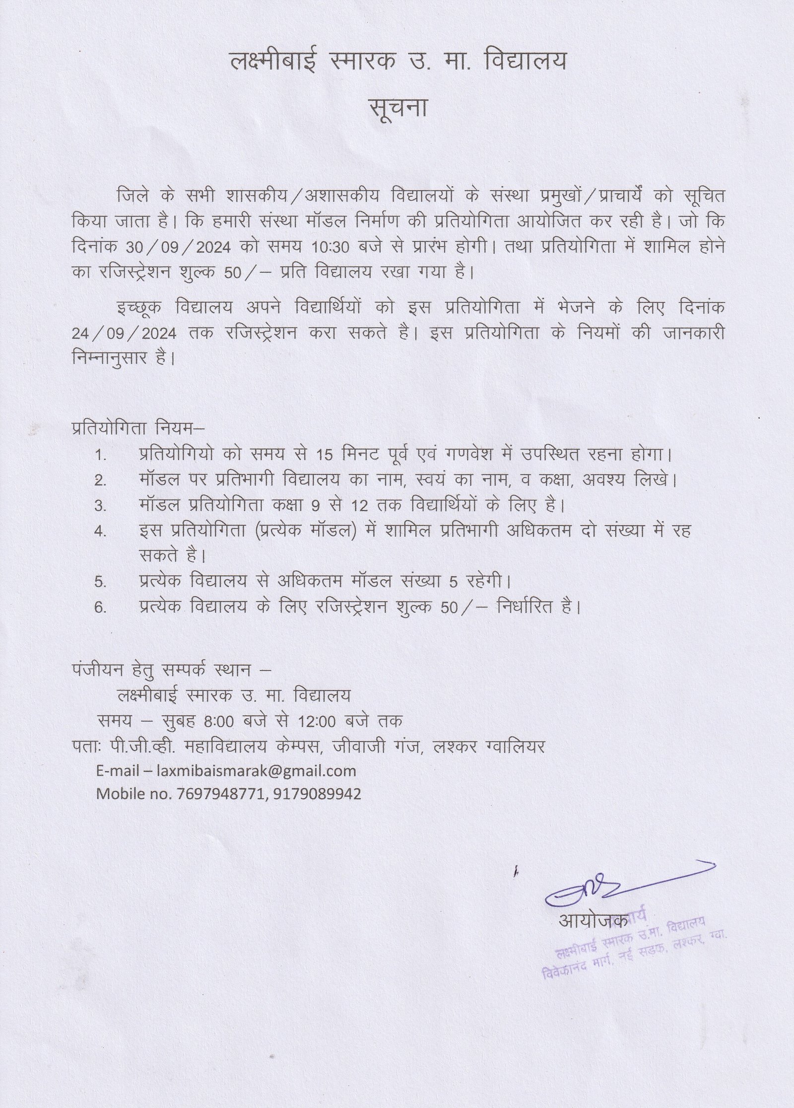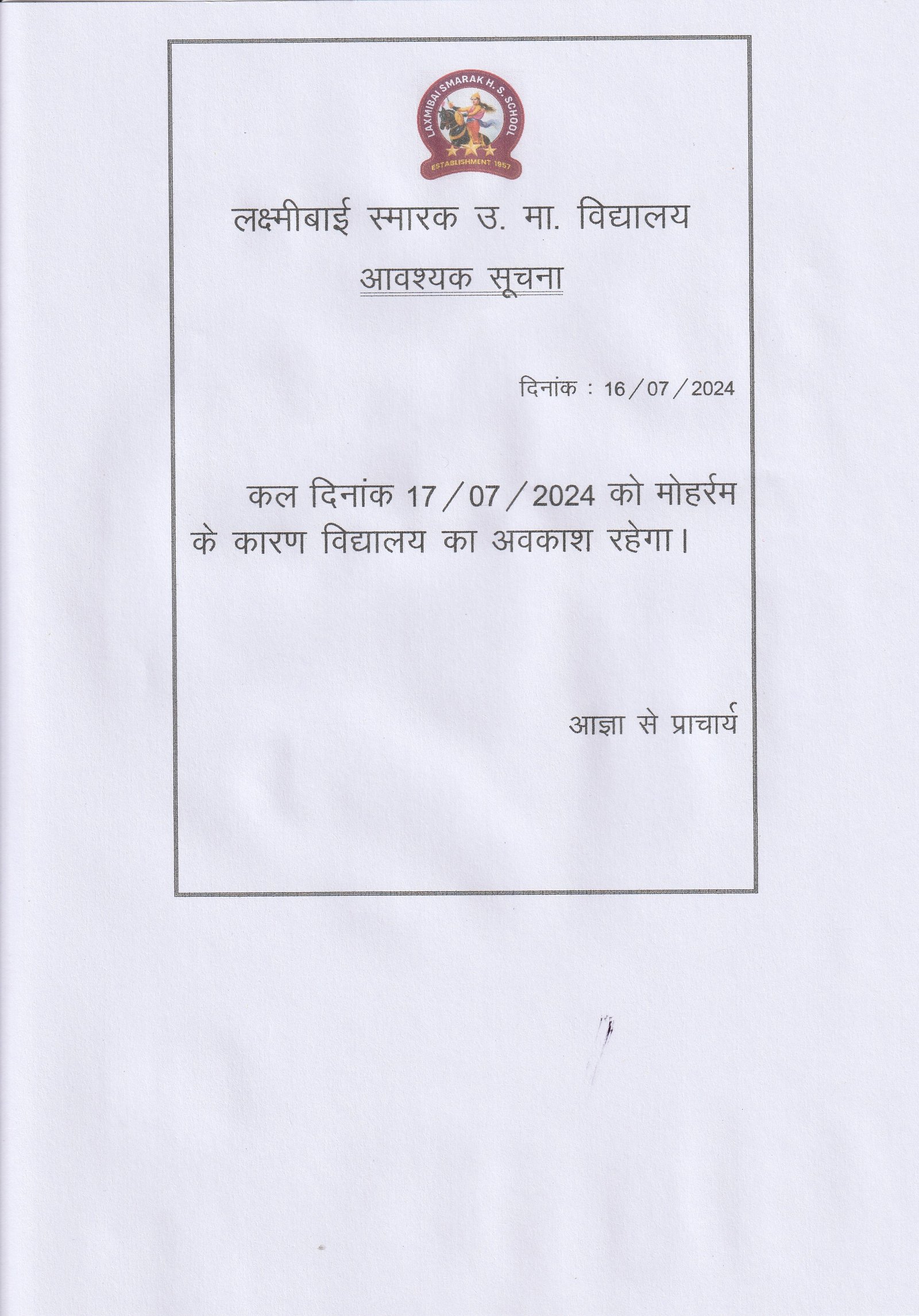 Learn More Our Courseविद्यालय एक दृष्टि में वीरांगना लक्ष्मीबाई शिक्षा समिति के पदाधिकारियों के असीम त्याग एवं परिश्रम के फलस्वरूप सन् 1957 में लक्ष्मीबाई स्मारक उ. मा. विद्यालय अपनी गरिमा एवं लोकप्रियता के कारण नगर में एक प्रतिष्ठित विद्यालय के रूप में विख्यात हुआ कालान्तर में यह विद्यालय उत्तरोत्तर प्रगति की ओर अपना कदम बढ़ा रहा है। नित नूतन नवोन्मेष की ओर अग्रसर इस संस्था की नूतन उपलब्धि यह हैं। कि काउन्टर मैग्नेट सिटी साड़ा में 5200 वर्गमीटर का वृहद शिक्षण परिसर हेतु भूमि क्रय की गई है। इस प्रकार यह संस्था शिक्षा की गुणवत्ता और प्रसार की दिशा में सतत् प्रयत्न शील है और शीघ्र ही शैक्षिक सुधारों के साथ-साथ नूतन संस्थान की आधार शिला रखेगी।